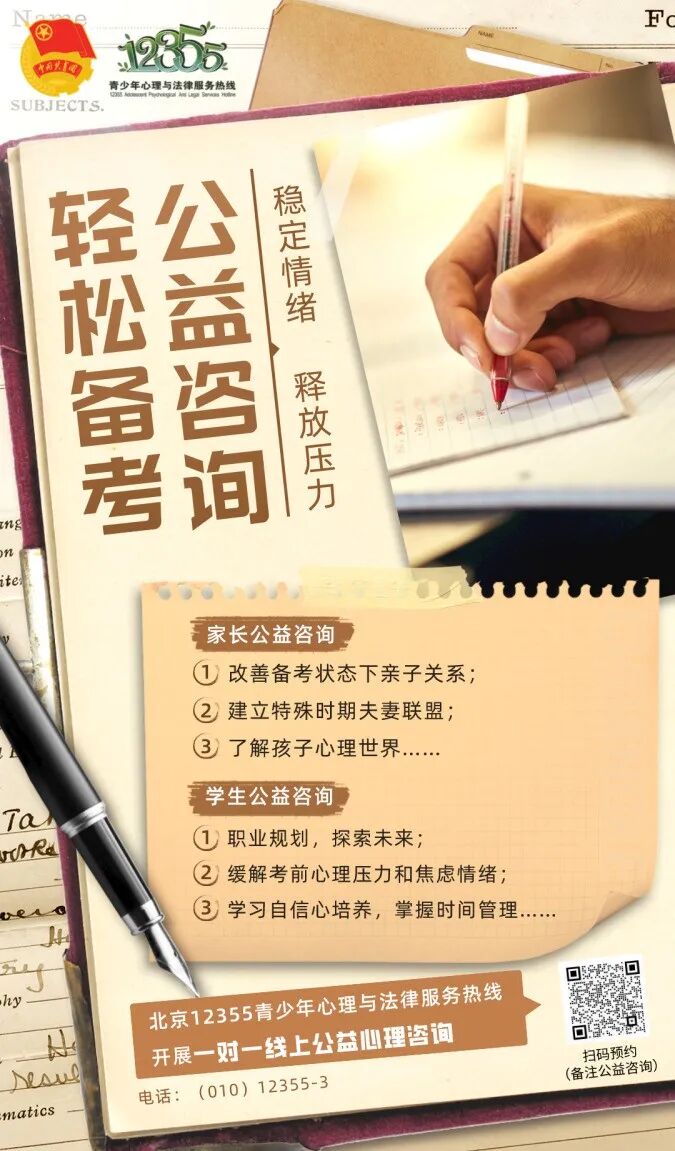 疫情防控形势下,备战中高考的学生及家长的心理健康及心理调试更为重要。北京12355青少年心理与法律服务热线为12-18岁青少年和家长提供一对一线上公益心理咨询,欢迎有需求的青少年和家长扫码预约。