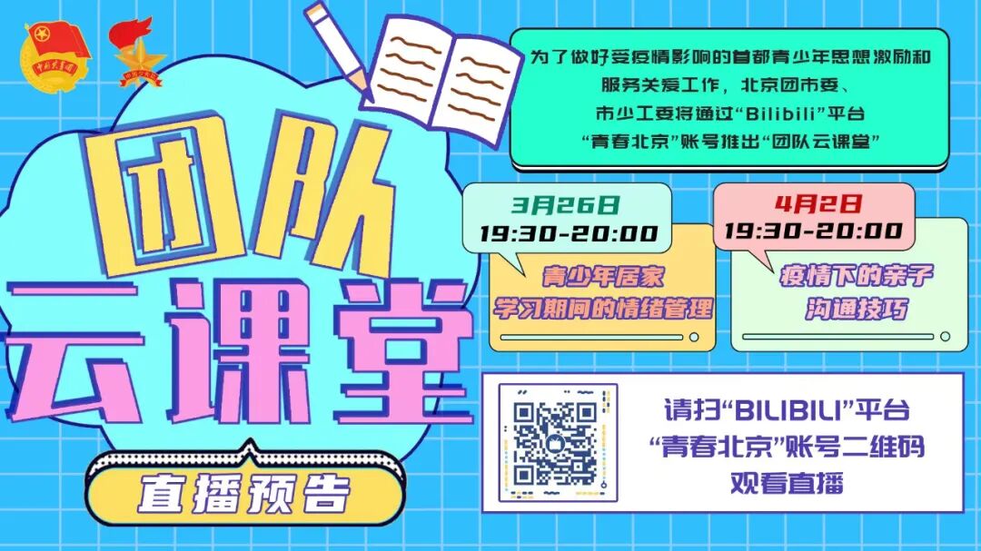 为了做好受疫情影响的首都青少年思想激励和服务关爱工作,北京团市委、市少工委于3月26日、4月2日19:30-20:00通过“Bilibili”平台“青春北京”账号推出“团队云课堂”,分别播出《青少年居家学习期间的情绪管理》《疫情下的亲子沟通技巧》直播课程。