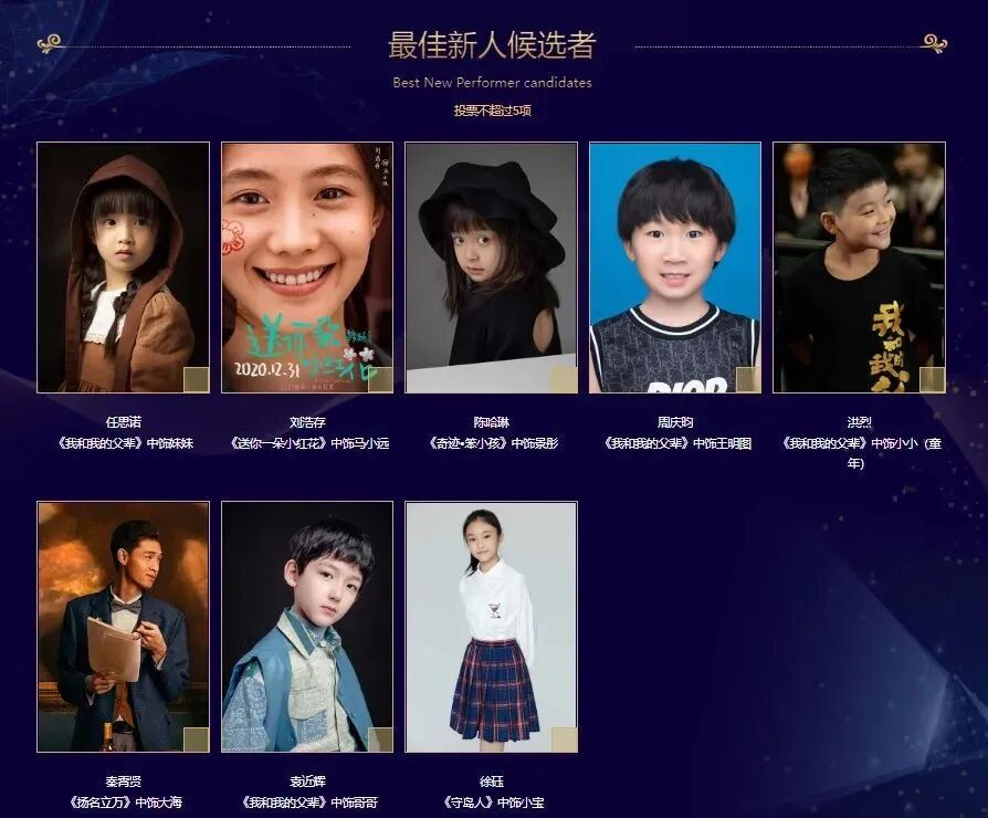 不止是他们,日前官宣的第36届大众电影百花奖的新人演员候选名单中,除了陈哈琳,还有《我和我的父辈》中的小演员任思诺、王明图、洪烈,以及《守岛人》的演员徐砡。