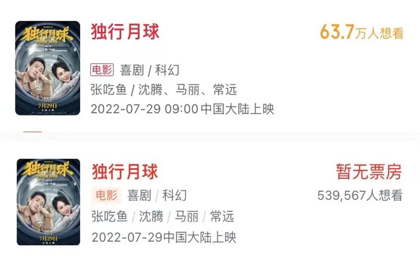 7月22日,定档仅3天的《独行月球》预售总票房(含点映)突破千万大关。“神马组合”的市场票房号召力,可见一番。
