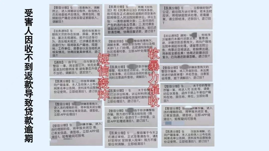 一旦无法偿还“美丽贷”的高额利息,贷款时填写的亲戚朋友电话将被轮番轰炸,留下的家庭地址也会由“社会人士”上门恐吓催收。