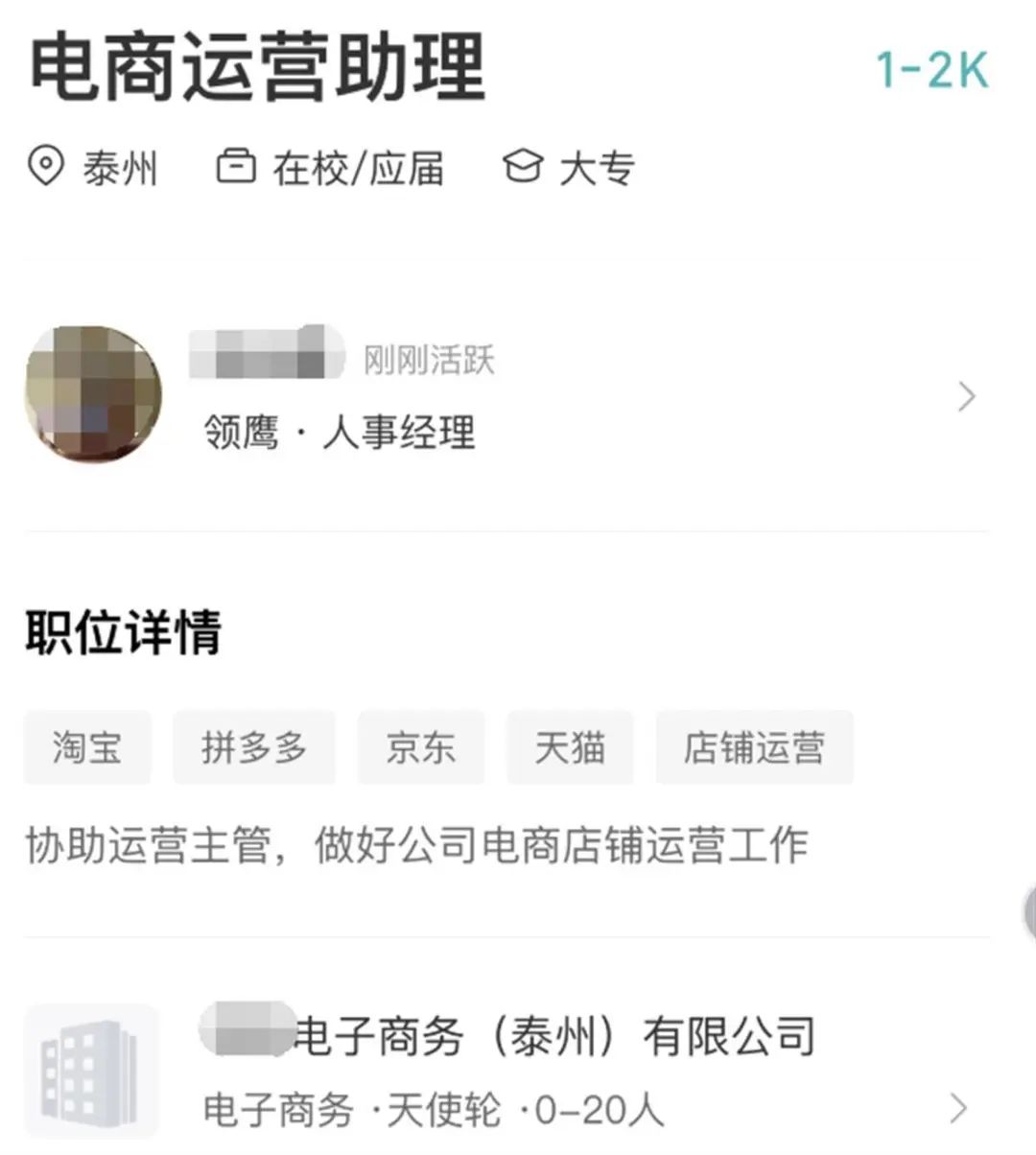截图显示,江苏泰州一公司正在招募电商运营助理。招聘详情称,公司创新目前招募两个岗位,一个是客服岗位,一个是运营岗位。