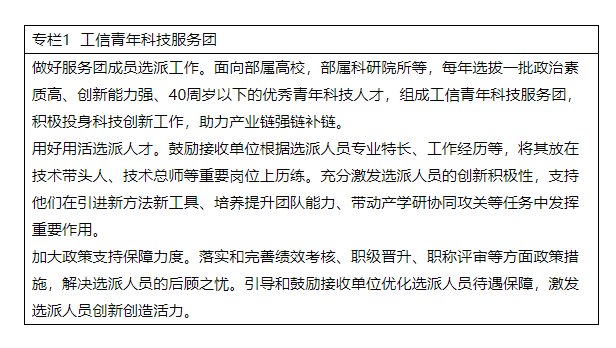 《意见》具体提出,要引导和支持政产学研等各方力量,着力培养一支政治素质高、创新活力强的青年科技人才队伍。组织实施工信青年科技服务团项目,引导优秀青年科技人才向重点企业流动。建立健全以信任为基础的青年科技人才支持机制,在重大项目资源分配等方面予以倾斜性支持,支持青年科技人才挑大梁、当主角。完善青年科技人才评价体系,加强和改进部系统高级职称评审工作,提高40周岁以下青年入选比例。提高部系统博士后流动(工作)站建设质量。