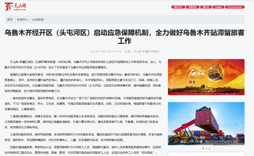 10月8日深夜“网信新疆”发文:近日,有部分网络媒体账号篡改天山网文章标题发布“滞留旅客可考虑留疆就业”“滞留旅客可在当地就业”信息,曲解原意,引发网民误读。经核实,相关信息来源于乌鲁木齐市人民政府新闻办公室2022年10月6日召开的疫情防控新闻发布会。会上,乌鲁木齐经济技术开发区(头屯河区)区长丁志军通报铁路乌鲁木齐站滞留旅客安置情况。丁志军表示,根据防止疫情外溢相关要求,10月4日起离乌列车及客车全面停运,部分旅客滞留乌鲁木齐站。截止10月6日,乌鲁木齐站滞留旅客86人,主要为来乌打工、探亲、就医人员,且在本市无固定住所。为安置好滞留旅客,乌鲁木齐经济技术开发区(头屯河区)立即启动应急保障机制,针对滞留旅客中的外地务工人员,根据需求,组织人员收集就业意向,由区就业办联系用工需求企业,推荐有电路、焊接、厨师、木瓦匠等方面经验的滞留务工人员,实现企业和务工人员的“双向奔赴”。据新疆日报,8日晚,新疆维吾尔自治区人民政府新闻办公室召开新冠肺炎疫情防控工作新闻发布会。会上,自治区疾病预防控制中心主任医师马合木提回答了记者提问。马合木提表示,传染病流行有其自身规律,新冠病毒奥密克戎BA.5.2变异株传染性强、传播速度快,隐匿性高,近两日来几个地区报告病例数再次快速增长,主要与社区隐匿传播没有彻底清除,一定数量的感染者以无症状状态存在,检测发现之前已经发生了隐匿性传播;一些地方对高中低风险区划分不科学不精准等有关;也与社区防控工作存在着一些短板,如专业人员短缺,核酸采集、消杀、标本转运、医疗垃圾处置不当以及工作人员个人防护方面存在的问题有关。疫情反弹和反复是新冠流行的特点,原因很复杂。本轮疫情防控难度大,目前还没有得到全面控制。后续疫情发展仍具有不确定性,各地可能仍有更多感染者检出,希望大家充分理解政府在控制传染源、阻断传播途径采取的各项防控措施,进一步坚定信心,强化疫情防控意识,积极配合社区做好疫情防控工作。另据新疆维吾尔自治区卫健委官网消息,10月8日0至24时,新疆维吾尔自治区新增本土确诊病例53例,其中,乌鲁木齐市天山区10例、沙依巴克区6例、高新区7例、水磨沟区6例、经开区2例,伊犁州伊宁市13例,吐鲁番市高昌区6例,巴州库尔勒市3例。