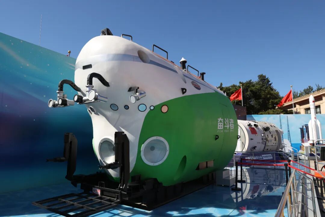 10月11日,北京展览馆“奋进新时代”主题成就展室外展区展示的“奋斗者”号全海深载人潜水器模型。光明网记者 季春红摄/光明图片