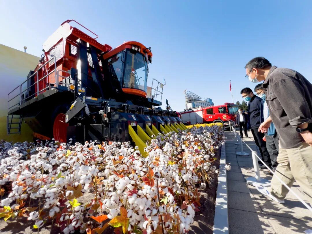 10月11日,北京展览馆,“奋进新时代”主题成就展室外展区,观众在参观六行采棉打包机。光明网记者 季春红摄/光明图片在王金波的记忆中,小时候,采收棉花就是家家户户每年秋天最重要的工作。天还未亮,他就要跟着父母下地摘棉花,一直到天黑才坐着装满棉花的拖拉机回家。“现在不一样了,机械采收已经代替了传统人工采收。机器工作时,人只需要坐在边上看着就行,完全自动化了。”他笑着说。展览中的这台机器,是由铁建重工新疆有限公司生产的六行采棉打包机,长10.28米、宽5.58米、高5.3米,净重达30余吨,具备棉花采收、打包一体化功能,能实现自主导航、自动打包控制、故障自诊断、数据远程监控等,每天可采收棉花超500亩。“这台机器具有6个独立采棉头,配备大功率双风机系统和潍柴770马力发动机,棉花采净率在94%以上、含杂率小于10%。”铁建重工新疆有限公司高端农机研究设计院副院长孙奎介绍,一台六行采棉打包机的采摘效率相当于1500多人手工采摘。此外,这种机器可以通过来回穿梭将待收的棉花压缩成棉包,“从天空俯瞰,就像在田野中‘画画儿’一样!”数据显示,2017年,我国棉花耕种收综合机械化率达73%,但机采率仅有28%。“当时,采棉机属于我国棉花种植全程机械化的短板,长期被外资品牌垄断。”孙奎说。为了研制出高端国产采棉机,孙奎多次带领研发团队到棉花采收一线听取农户需求。他们发现,传统的箱式采棉机采摘棉花后,农民仍要花大量人力、物力进行打包。“采棉机最关键的就是打包功能,我们在六行箱式采棉机的基础上,不断试验打包系统及包膜模块结构,确保打包性能可靠。”铁建重工新疆有限公司农机具研究所工程师文世昌说。最终,经过数十次的实验与校正,2018年9月8日,铁建重工4MZ-6自走式采棉机在新疆下线,填补了国内六行采棉机产品空白,2020年平均单台采收亩数达11000亩,最高单台采收17777亩。3年后的2021年,更加先进的4MZD-6采棉打包机上市,可满足采棉、集棉、打包、逐出和丢包等一系列动作,真正实现了采棉、打包一体化,并凭借采净率高、智能化高、性价比高深受农户青睐。近期,中国农业机械工业协会还向铁建重工新疆有限公司颁发了《科学技术成果评价证书》,认定铁建重工“智能打包采棉机关键技术研究与应用”成果整体已达到国际先进水平,部分达到国际领先水平。“未来,我们还将继续投入研发高端农机系列产品,为提升新疆棉花品质、全面推进乡村振兴贡献力量。”孙奎说。