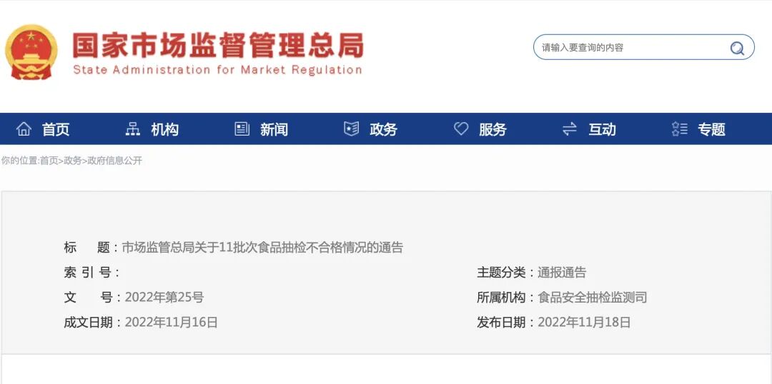 国家市场监管总局11月18日发布了11批次食品抽检不合格情况通告。近期,市场监管总局组织食品安全监督抽检,抽取粮食加工品、餐饮食品、茶叶及相关制品、乳制品、饮料、酒类、糕点、炒货食品及坚果制品、饼干、淀粉及淀粉制品、方便食品、薯类和膨化食品、豆制品、蜂产品、蔬菜制品、水果制品、肉制品、水产制品、调味品、婴幼儿配方食品和食用油、油脂及其制品等21大类食品728批次样品,检出其中餐饮食品、酒类、饼干、方便食品、薯类和膨化食品、肉制品、调味品和食用油、油脂及其制品等8大类食品11批次样品不合格。发现的主要问题是,生物毒素、微生物污染、食品添加剂超范围超限量使用、质量指标不达标等。