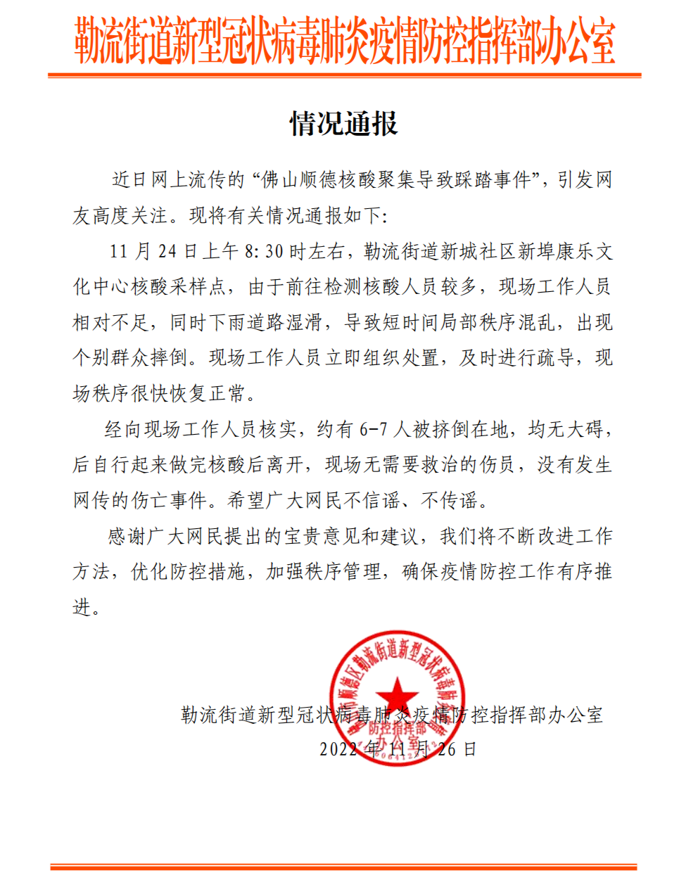 近日网上流传的“广东佛山顺德核酸聚集导致踩踏事件”,引发网友高度关注。11月26日晚,佛山顺德区勒流街道新型冠状病毒肺炎疫情防控指挥部办公室通报,确有6至7人被挤倒,但均无大碍,没有发生网传的伤亡事件。通报称,11月24日上午8:30左右,勒流街道新城社区新埠康乐文化中心核酸采样点,由于前往检测核酸人员较多,现场工作人员相对不足,同时下雨道路湿滑,导致短时间局部秩序混乱,出现个别群众摔倒。现场工作人员立即组织处置,及时进行疏导,现场秩序很快恢复正常。经向现场工作人员核实,约有6-7人被挤倒在地,均无大碍,后自行起来做完核酸后离开,现场无需要救治的伤员,没有发生网传的伤亡事件。希望广大网民不信谣、不传谣。佛山顺德区勒流街道新型冠状病毒肺炎疫情防控指挥部办公室表示,今后将不断改进工作方法,优化防控措施,加强秩序管理,确保疫情防控工作有序推进。![]()