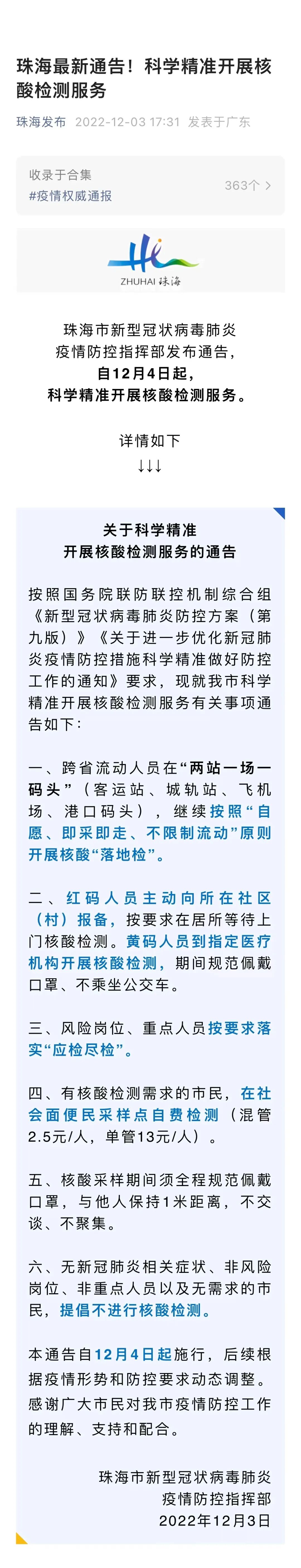 目前,回家、回社区(除高风险区以外)以及乘坐公共交通这些都不需要出示核酸阴性证明,所以市民朋友可以做出一个合理的选择该不该做核酸。据“珠海发布”微信公众号消息,珠海市新型冠状病毒肺炎疫情防控指挥部发布通告,自12月4日起,科学精准开展核酸检测服务。