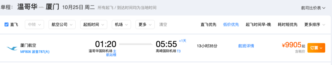 搭乘国泰航空,10月22日从温哥华直飞香港,单程票价只要人民币6470元,约合加币1253元。搭乘厦门航空,10月25日从温哥华直飞厦门,单程票价只要人民币9905元。△这里是广告△