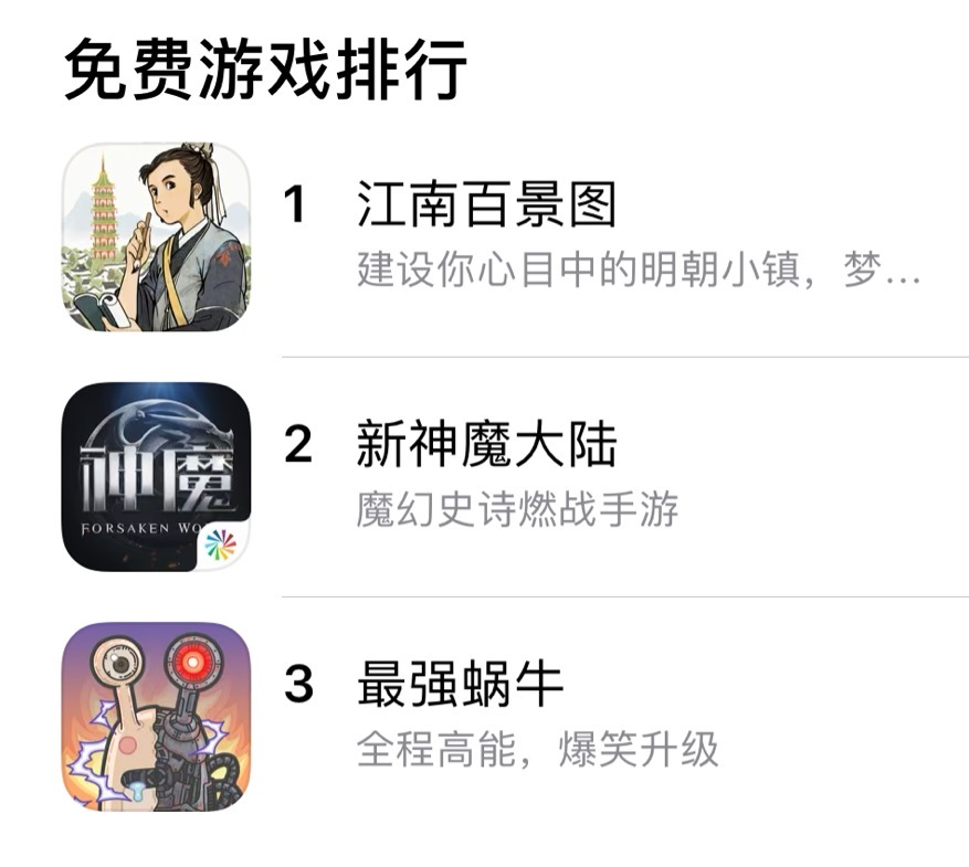 在以往,大厂凭借资源优势和传统营销套路,往往能轻松把新品推到免费榜第一。但这段时间里,先有《最强蜗牛》压过《三国志幻想大陆》,后有《江南百景图》压过《新神魔大陆》,连阿里、完美这样的大厂都会被黑马突袭,可见市场变化之快。