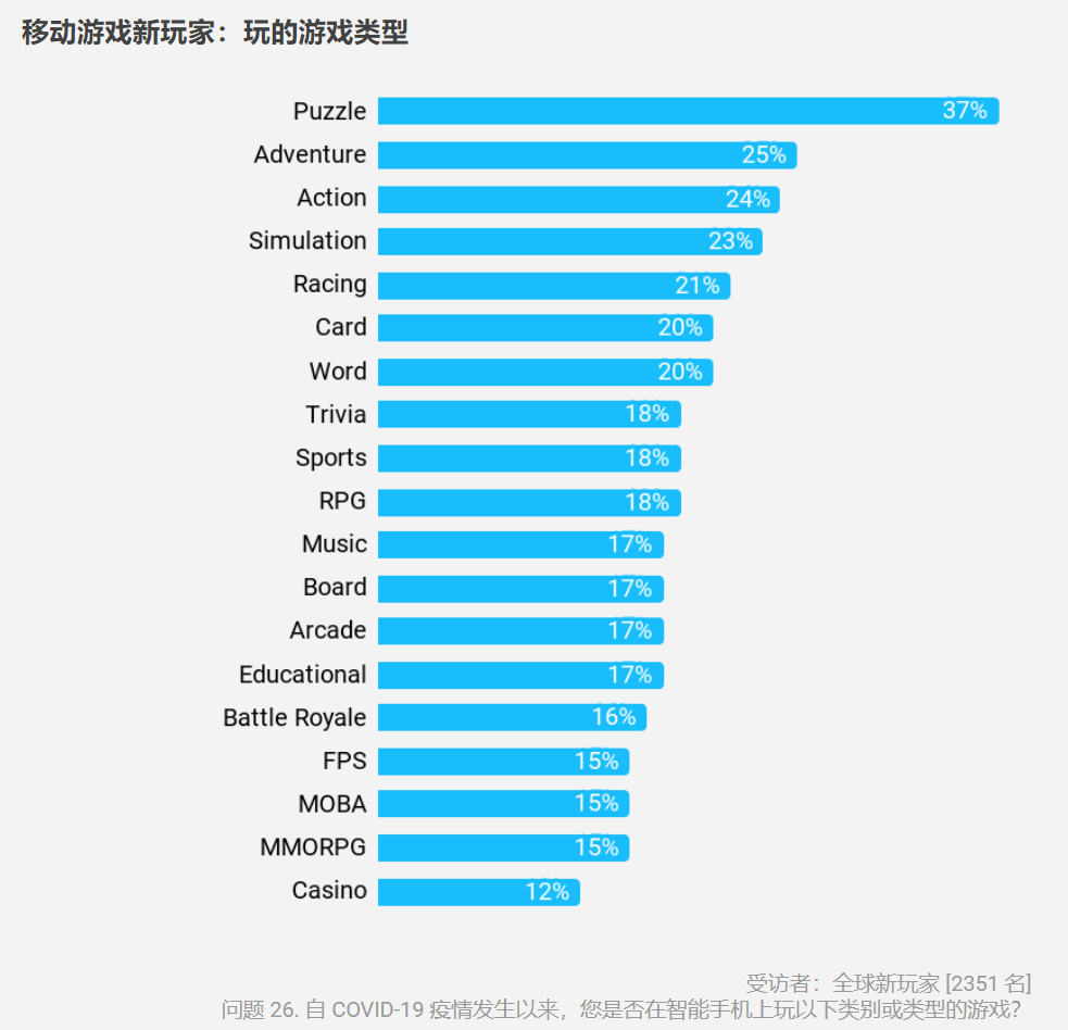在时间方面,64% 玩家会产成“不可逆的变化”,固化疫情时期养成的习惯。首先,新玩家很可能会进化为常驻用户,尤其是有37% 新玩家都选择了益智游戏,从这种易上手的游戏入坑,他们很有可能会持续不断地尝试新游戏;