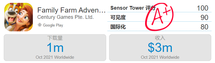 这个月初,点点互动(Century Games)的模拟经营新作《菲菲大冒险》(Family Farm Adventure)进入到了美国iOS畅销榜Top 100,产品从8月初开始有能追踪到的畅销榜排名,3个月的时间从150~200 的区间稳定到了100以内。