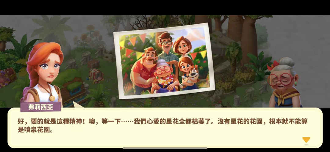 此外,相比同类的一些模拟经营手游,《菲菲大冒险》一些细节刻画上,也在强化这种冒险的代入感,比如一些剧情推进会用格漫的方式,来快速交待故事走向;再比如有些对话当中会有多个选项,也会让人联想到一些文字冒险游戏的常见要素。这些都塑造了更多的情节,尽管故事本身不算多出彩,但还是多了不少曲折的走向。