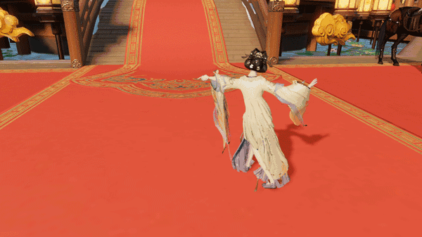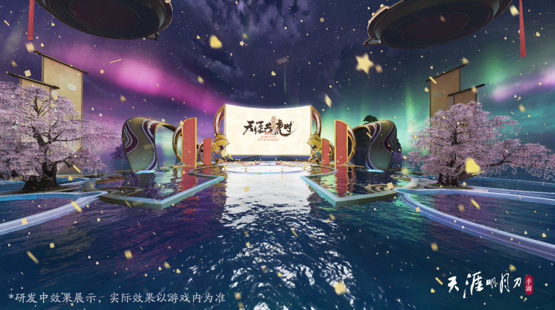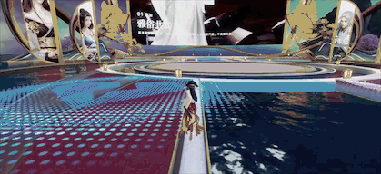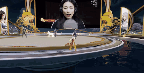 以往,天刀线下嘉年华都会有华服走秀环节,为了做出春晚的差异性,团队想到了虚拟和现实交织的方式。《月秀华裳》节目中,大屏幕会播放真人在永定土楼的走秀视频,玩家参与进来在游戏内投票,侧重交互;NPC穿着游戏里受玩家欢迎的外观,在舞台上展现动作特效,侧重观赏。
