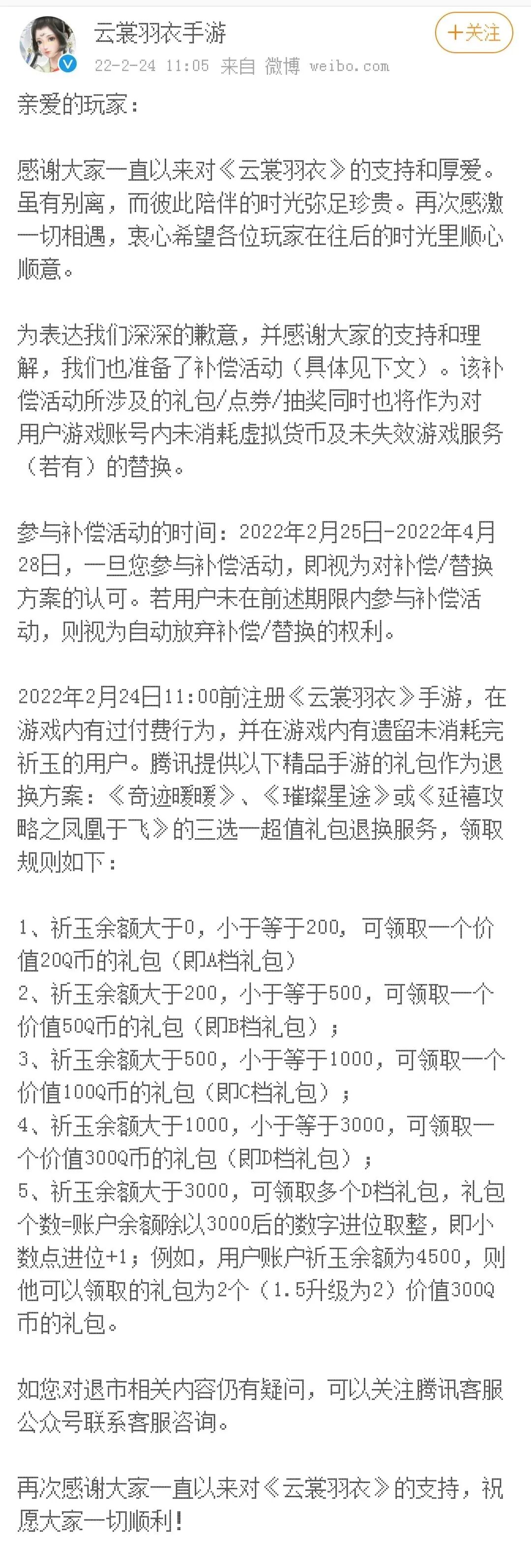 事情还得从一个月之前说起——今年2月20日,葡萄君曾关注到《云裳羽衣》发布的停服消息:公告表示,游戏将于2月24日停止充值和新用户注册,于4月28日正式停止运营。此后,除法律法规另有规定或腾讯与用户签署的协议另有约定外,游戏内的所有账号数据及角色资料等信息将被全部删除。