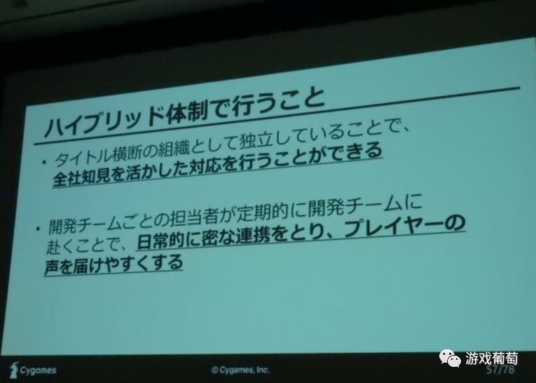 针对上面两个无法活用知识的情况,Cygames的运营团队采用了不即不离地与各开发团队协力合作的混合体制,从而避免这样的问题,具体包含: