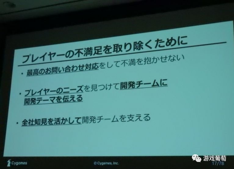 就在前不久,Cygames的客户支持部副经理副岛达矢以“支撑最佳内容的客户支持体制”为题,详细讲解了他们是如何做用户运营的。他表示,Cyames的客户支持,并不是从始至终只应对玩家的反馈,而是以将用户对游戏内容所抱有的不满因素剔除作为主要工作重心,为了实现这一目的而与团队进行了一系列的配合。