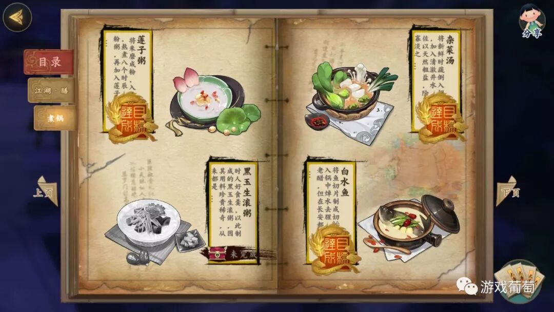 烹饪玩法的内容深度体现在菜谱中,当前版本菜谱共二十一页,包含近百种菜肴,所有菜肴的制作方式需要自行探索获得。