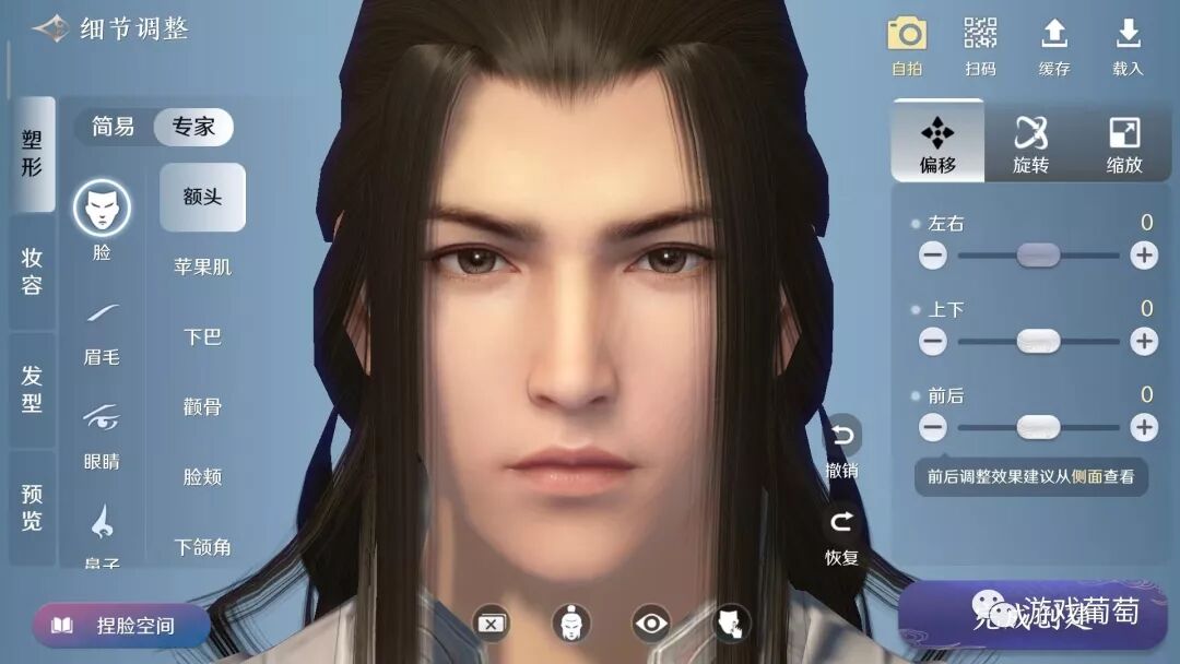 专家模式提供了更为详细的参数选项,除了位置调整之外,还可以进行旋转和缩放,对五官进行角度和大小的调整,这样一来玩家从更多维度调整面部细节。