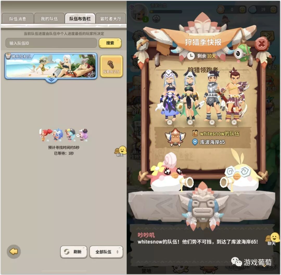 《乌拉拉》则更看重组队游玩的社交体验,常规界面的下半屏都是聊天记录,一整个分页的组队界面、队友调配权限,以及周期性狩猎榜单都在鼓励玩家间更频繁交互。