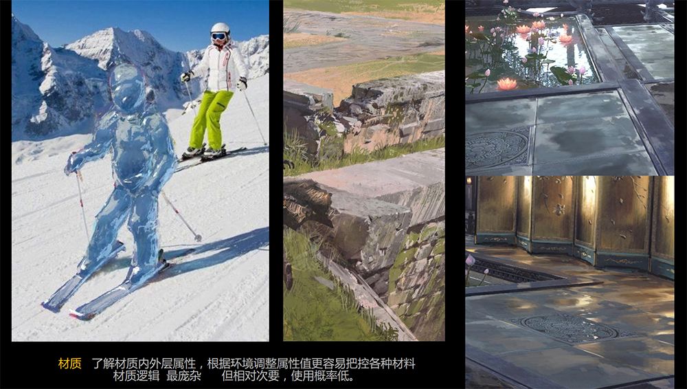 大家要根据自己的画风来看,如果画风比较写实或者偏科幻,牵扯到各种玻璃、各种反射,就要研究得多一点;如果是画东方题材、古代题材就要把水、地砖搞清楚。这些东西相对比较次要,使用概率也比较低。