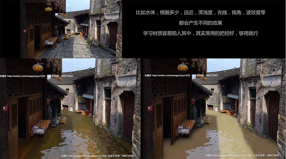 比如画到水,左边是我找的一张网上的照片,中间是我在照片中加了两种水,透明的水和浑浊的水。可能有些人会觉得觉得我会画完水了,以后所有水都能解决,但水其实特别复杂。