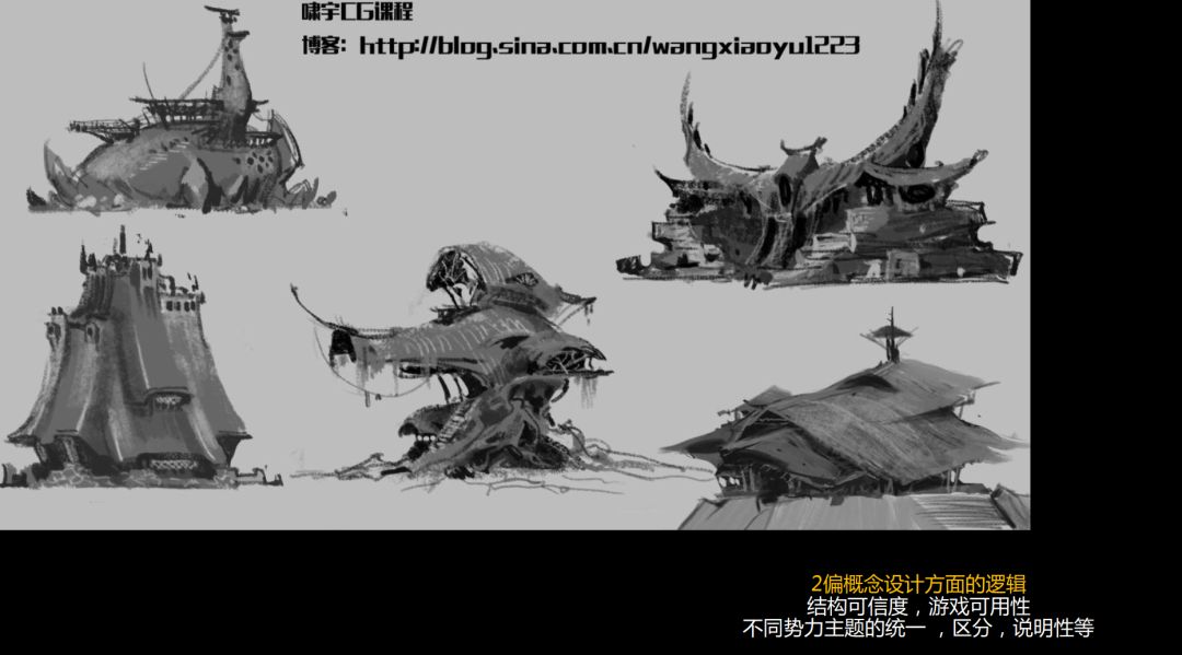 刚才讲了一些现实中成像的逻辑,下面是偏概念设计的逻辑。比如结构可信度, 游戏可用性,不同势力主题的统一、区分和说明性。我之前大学玩《魔兽世界》,暴雪在这方面做得特别好,对我影响很大。比如暴雪的《星际争霸》,虫族是圆形和刺比较多,神族三角形比较多,人族里钝的方形比较多。他们会把形状、颜色、材料、装饰细节从主到次分配给不同种族、势力,单个角色又有自己的特色。