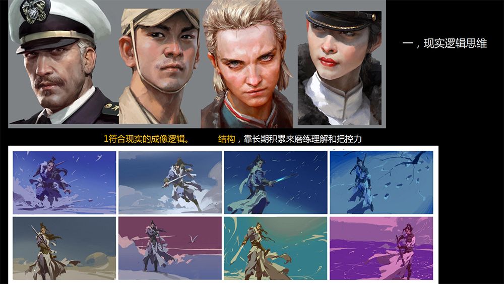 1. 现实逻辑思维,说白了就是怎么想象自己在三维现实中构建世界。前面大概介绍一下,一个是结构,就是人体、长相、建筑,怎么用结构表现出来。我一般是用块面和色块,这个需要非常长时间的磨练和把控能力,新人先解决整体的生动感觉和准确程度,再逐渐去考虑细节。