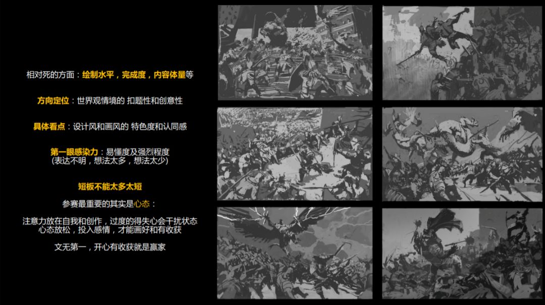 第二个,方向定位,世界观情境,扣题性和创意性。有些同学会在比赛中吃亏,可能画的特别好,但画的内容和题目完全不沾边,不知道是不是受了我上次说大家不要被历史资料限制,要充分发挥想象力的影响。扣题性和创意性同时达到是比较难的,你既要让大家认可,同时要让大家眼前一亮。