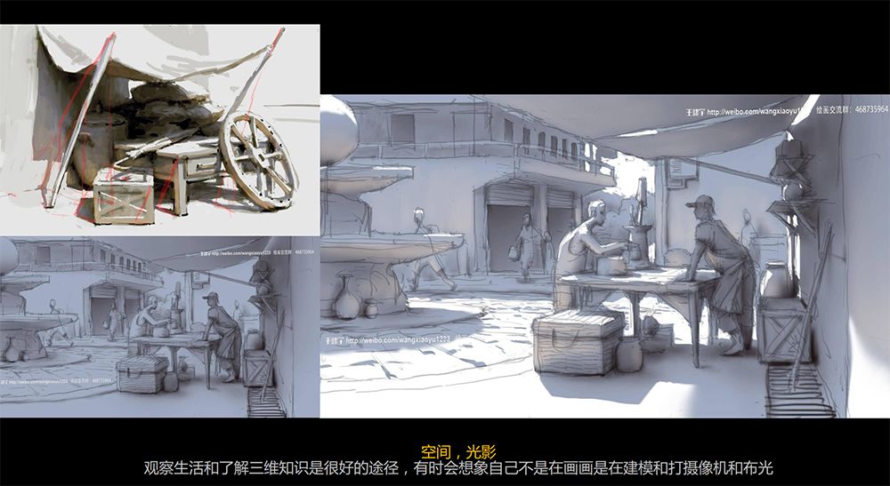 2. 光影和空间的知识,大家要了解现实中的光影,比如虚的光影和实的光影,在很多环境下,这些光影交织在一起的时候的状态。
