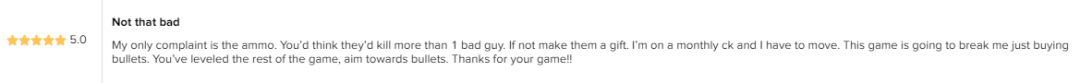 “我唯一想吐槽的就是这个子弹,你可能以为手枪里那一颗子弹能击败不止一个坏人。游戏里买子弹的设定快要逼疯我了。其他都很好,改改子弹的问题吧。”
