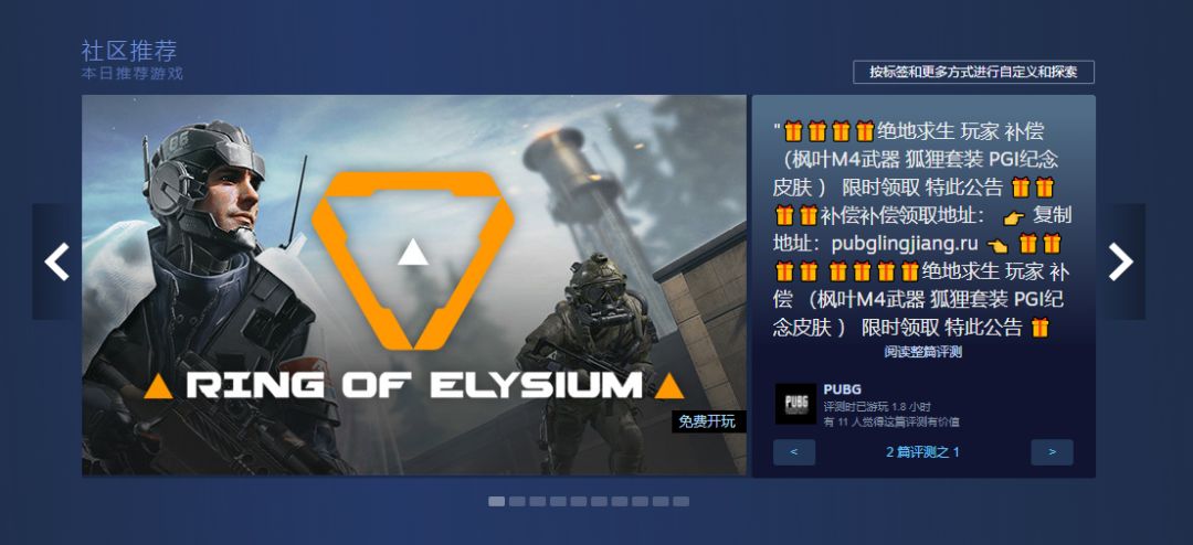而名为“PUBG社区管理”的账号于3月6日在这个游戏下贴上了小广告,并刷了261个赞,Steam的社区智能推荐系统将其误识别为“有价值的鉴赏家评测”,纳入了社区推荐流。