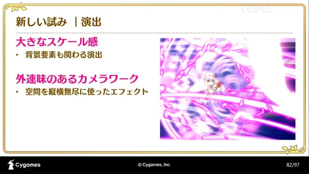 而通过在SD演出时也加上万花筒的效果,也能与特写动画产生关联性。此外,由于《公主连结》的游戏流程是从左至右的,特写动画的最终画面几乎也都是要向右走的。