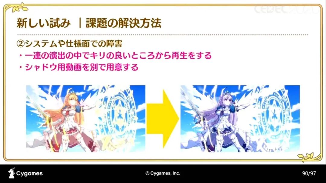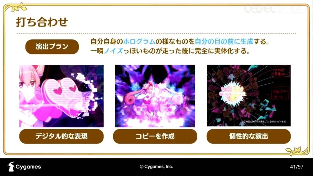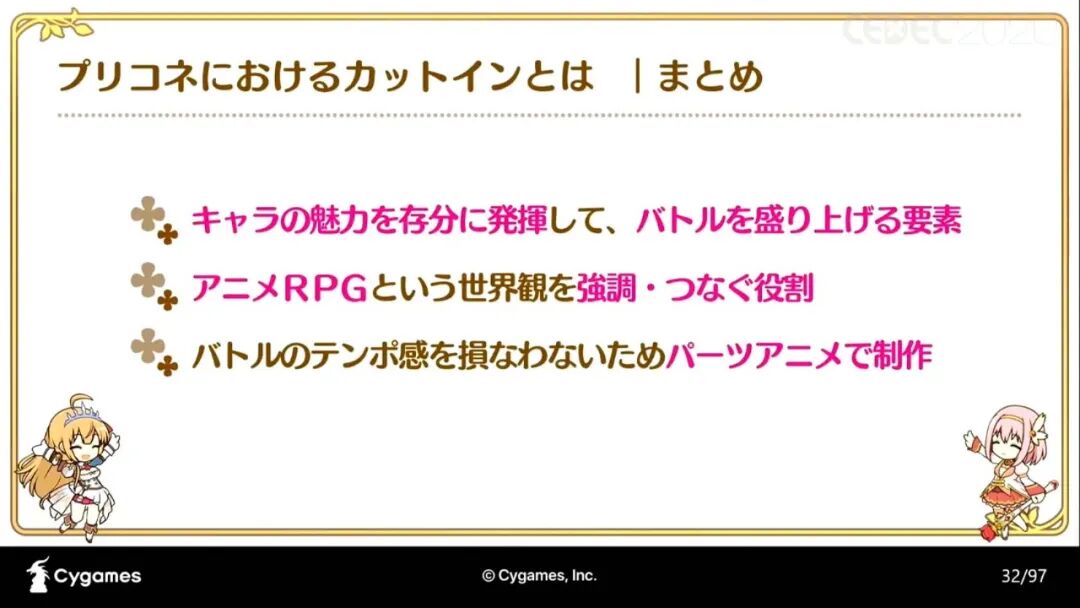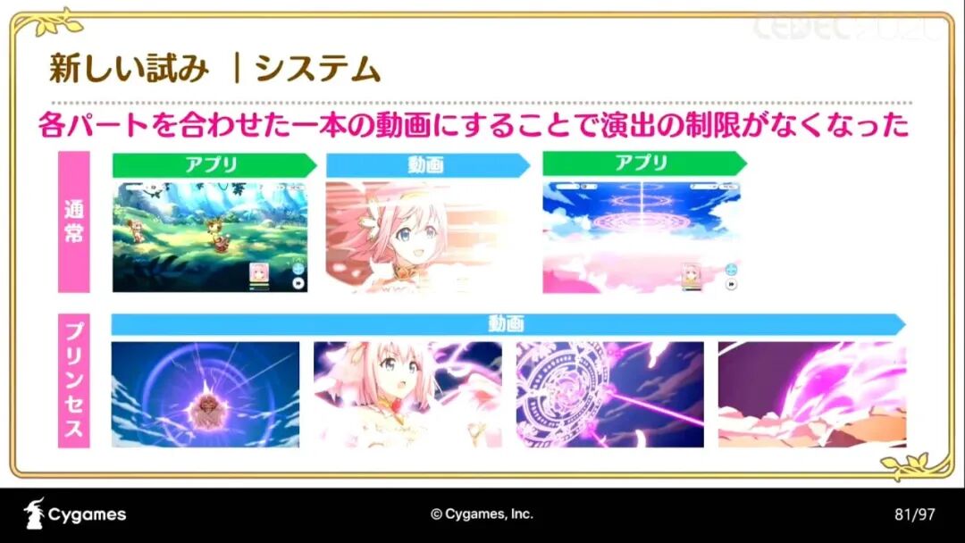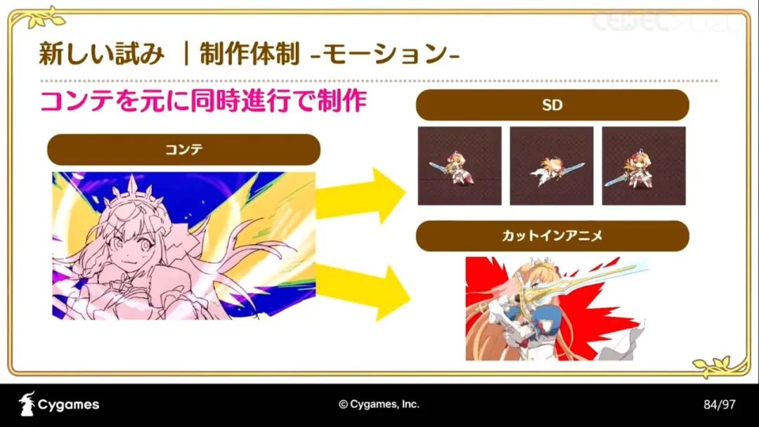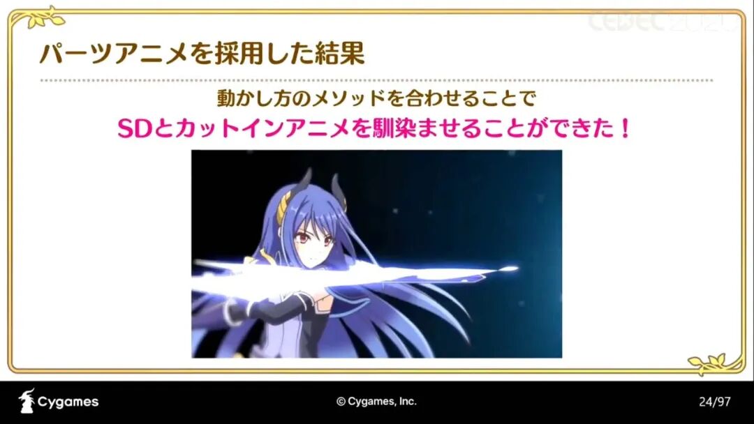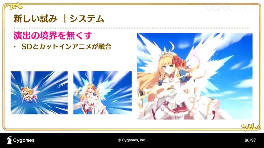 “《公主连结》在加入动画演出时所采用的三种制作法,分别是“在游戏中加入动画产生的问题和解决办法”;“将手绘动画和部件动画结合制作的手法和流程”;“如何制作有统一感的动画演出和SD角色的演出(以下略称SD演出)”。