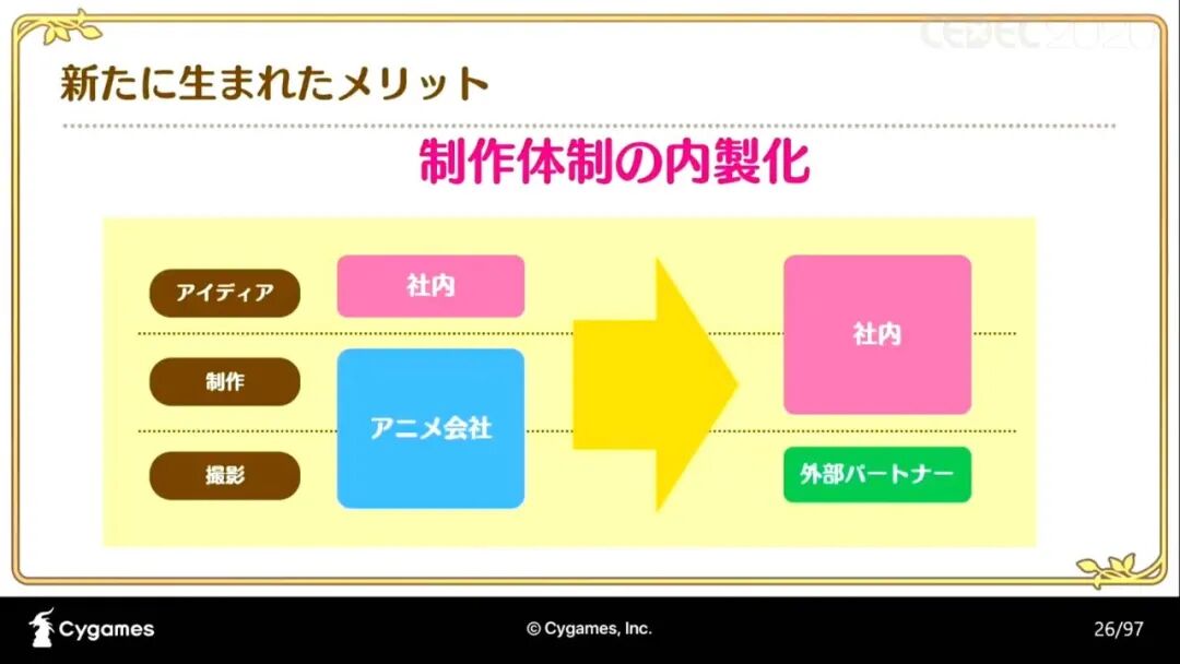 另外,由于减少了作画张数,而公司内部也对部件动画的制作有一定的经验,这部分的动画制作可以完全由公司自己制作(不用外包)。由此,在方向性的意见交流上也变得更有效率,成品反馈与返工也变得更简单。