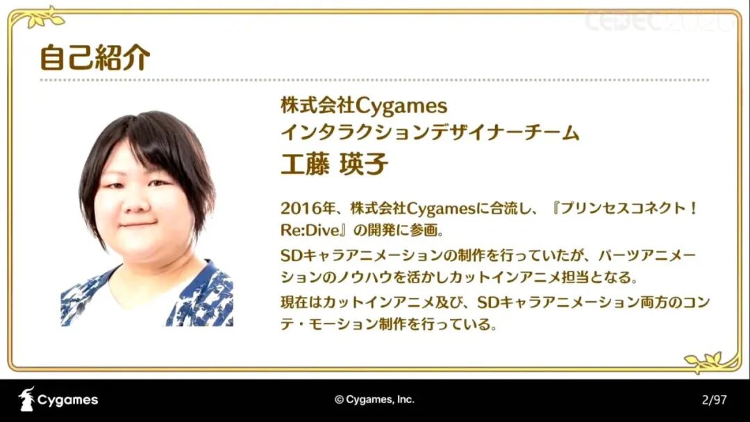 工藤瑛子于2016年加入Cygames,参与开发《公主连结Re:Dive》(后文简称《公主连结》),她擅长SD角色动画制作,也因部件动画的制作经验丰富,而负责游戏特写动画的制作,目前她正在这两个方向进行制作。