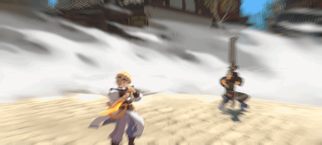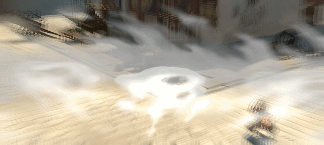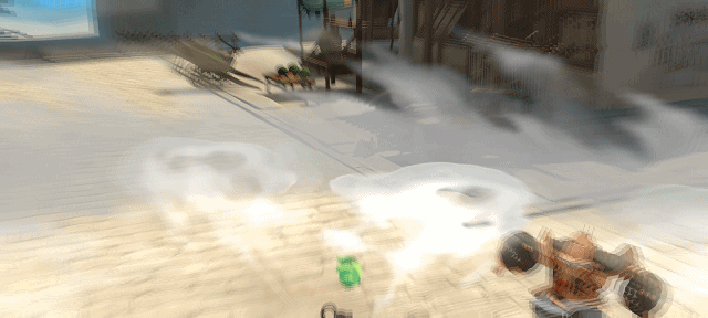 而且往往还伴随着各式各样的运镜,比如技能跃起、冲刺或跳下,都有与相适的屏幕震动、摇晃,再比如敌方发起攻击的时候,镜头就会转到我方正对的方向,玩家此时会站在敌对的视角上,以一种更有临场感的方式来观看战斗。