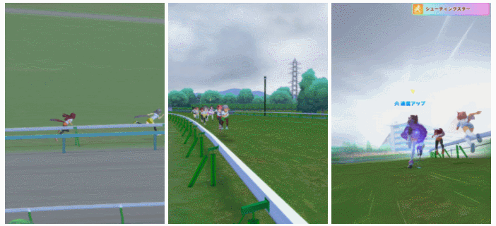 在主角唱出「希望比任何人都要更快」的歌词时,镜头则直接切为主角的第一人称视角在舞台上奔跑,有让玩家在赛马娘的视角下理解她们的愿望,看到她们在赛场上所见的意味。