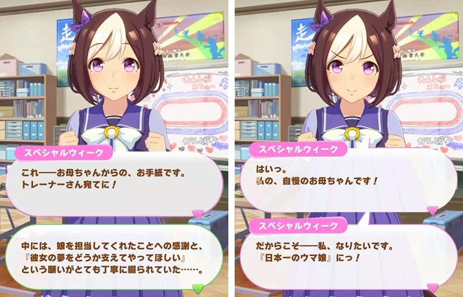 开场特别周的母亲会透过信件,希望玩家实现特别周的梦想,特别周也以母亲为骄傲