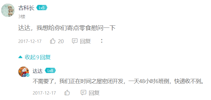 半年多的时间,他们就这样紧贴着社群做优化。达达每周都要在TapTap上发三四次帖子,时间一久,达达这个名字也在玩家内部变得极为熟络。