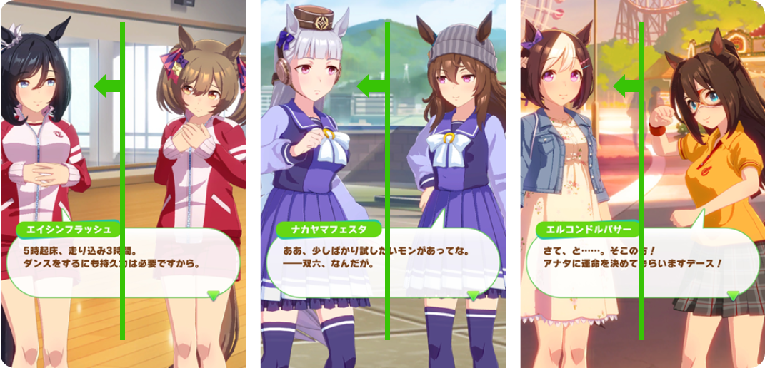 角色也有了需要努力成长才能达成的目标,玩家与角色间的关系也明确地划分为「训练师」与「赛马娘」。伴随着角色成长,留白信息开始逐渐增多,这些信息埋藏在各个主支线剧情当中。