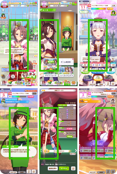 游戏利用边框压缩视野的方式,为赛马娘提供了居中呈现的舞台,使游戏画面时刻都有着明确统一的主体(赛马娘)。这种设计几乎贯穿了游戏从主界面到单局养成的所有画面。