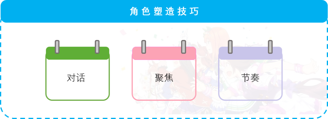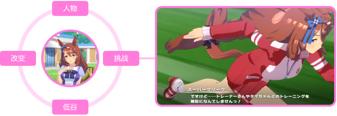 当然,一个角色的可信度,并非由简单的「矛盾&成长」就能构成,还关乎如何将其呈现出来的技巧。在拆解了《赛马娘》的内容结构后,我发现Cygames为此引入了3种漫画、影视行业中常见的创作手法: