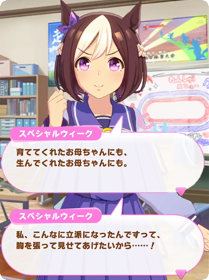 而在特别周与训练师初次见面时,她的自我介绍便为这些对话埋下了主基调:「无论是生下我,还是养育我的妈妈,我都和她们约好了,我一定会成为日本第一的赛马娘!成为了不起的样子!」