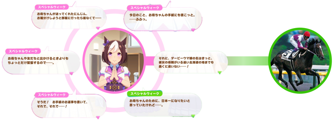 最广为人知的便是「特别周」两位母亲的故事。特别周尽管也提过生母与养母的事情,向训练师介绍母亲与自己的承诺、她在北海道度过的生活,养母甚至还通过信件感谢训练师对特别周的照顾。