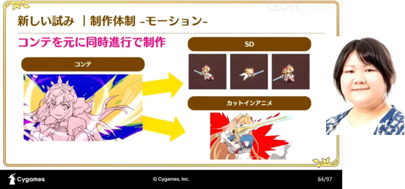 《公主连结》的交互设计师在2020年的分享中提起,制作组在仅有2秒时长的角色技能演出中,探索了「部件动画」「手绘制作」「量产流程」等众多设计路线,不断深挖2秒动画能带给玩家的细节体验,最终目的是为了「最大限度地为玩家呈现角色魅力,制作出有统一感的游戏演出。」