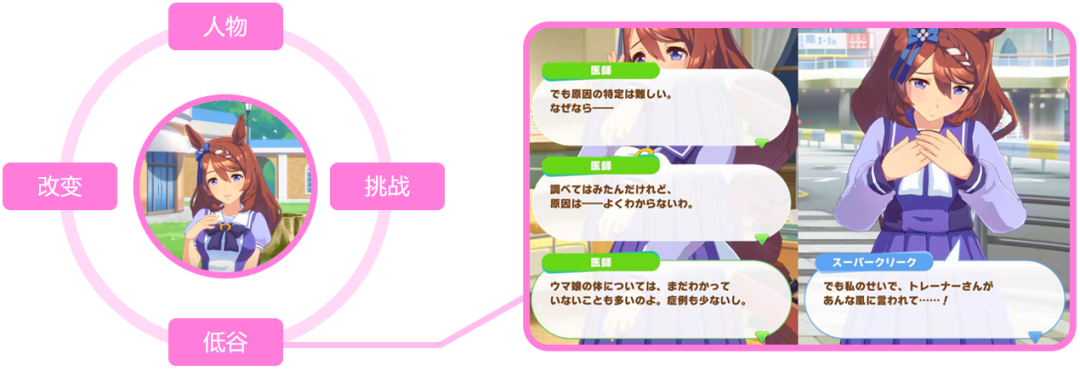 所以我们可以在《赛马娘》中看到,主要角色一直在与不同的次要角色对话,通过对同一话题的不同角度回答,玩家得以从多角度感受逐渐丰满的角色形象。