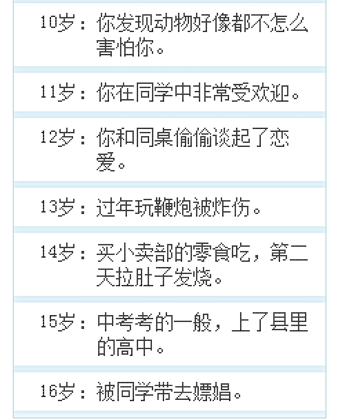 之后的过程就与你完全无关,你只要不停点点点,就能看到角色一年一年长大,以及ta在成长中所经历的事情。