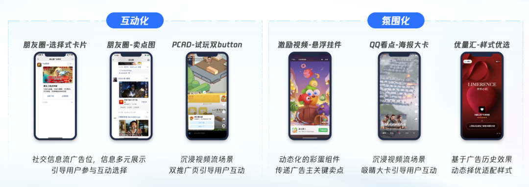 效果优化上,首先是筛选优质流量,如微信、QQ小世界、片多多的视频化策略;优量汇的优选机制;微信、QQ购物号、腾讯看点的动态化策略等。其次是摸索更多的互动形态,比如朋友圈卖点、选择式卡片等互动广告;激励视频悬浮挂件、QQ看点海报大卡、优量汇样式优选等氛围化广告等。